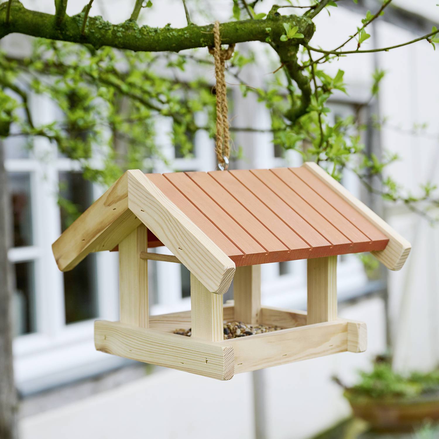 Ta majhna ptičja hišica bo na vaš vrt privabila različne ptice. Služi kot krmišče in zavetje za živali, za kar vas bodo nagradile s svojim čudovitim petjem.