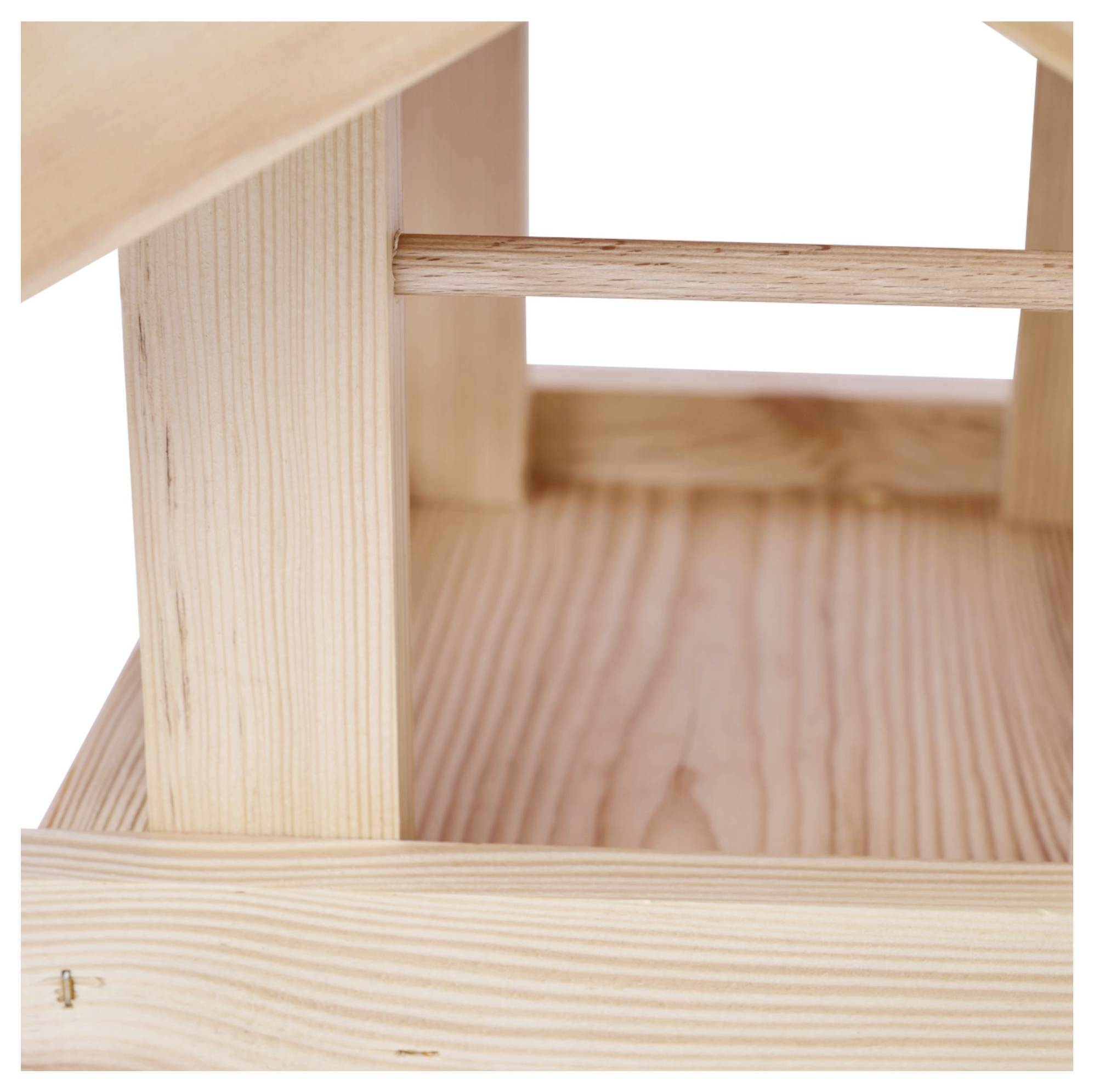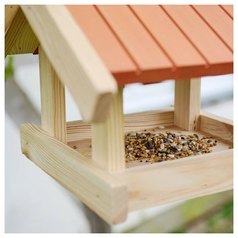 Stojalo za ptičjo hišico navdušuje s svojo rdečo streho in sivo-modrim podstavkom. Les je obdelan z naravnimi barvili, da se prepreči ogrožanje dobrobiti živali.