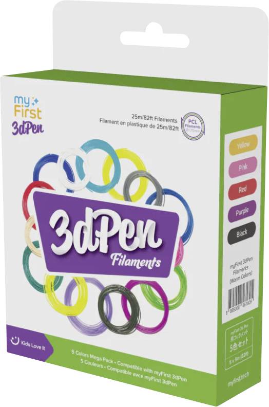 Nadomestni filamenti za 3D pisalo myFirst. Paket vsebuje 5 x 5 metrov dolgih filamentov v različnih barvah.